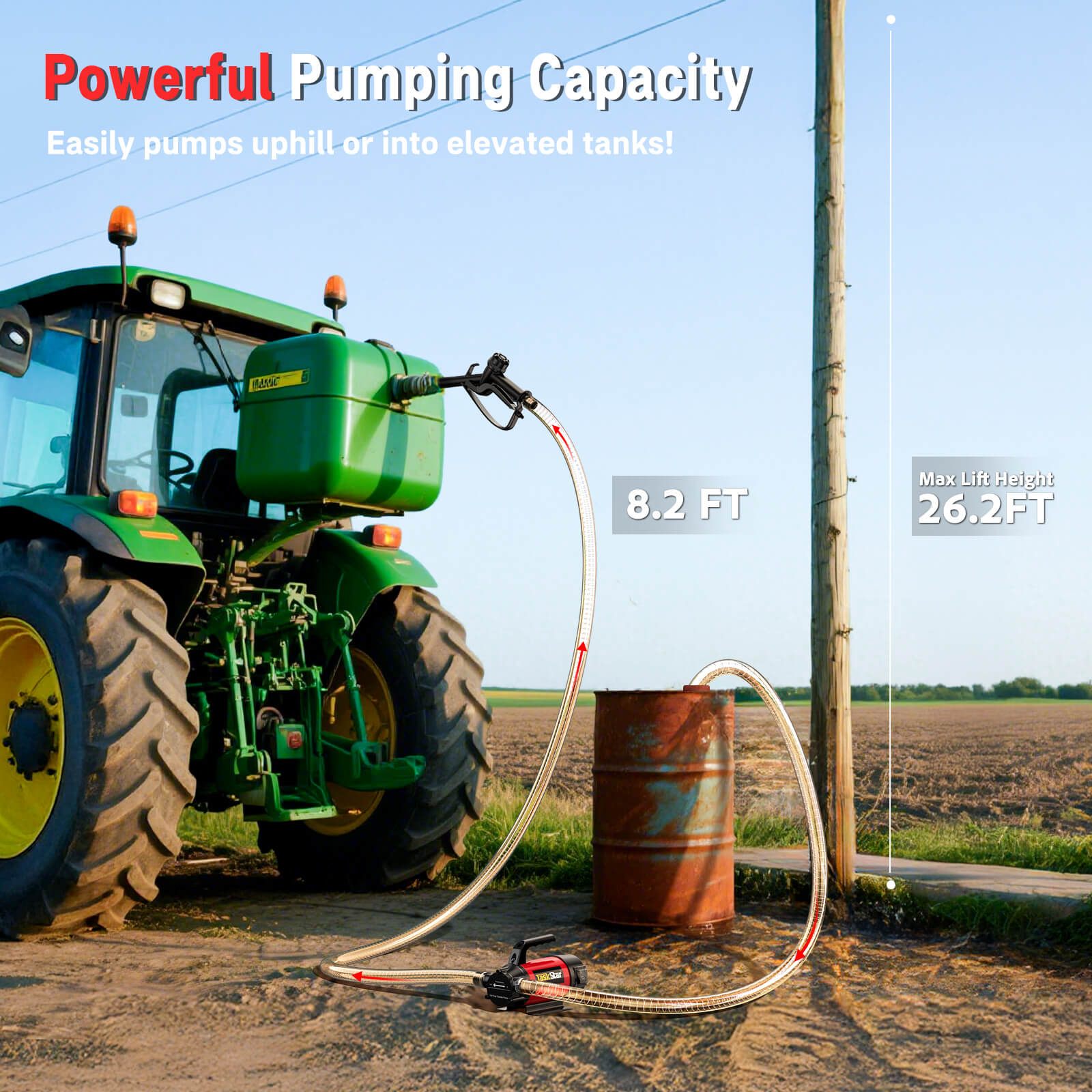 Compact and portable, it reaches distant tanks and high fills—no power outlet required, just clip to your vehicle battery.